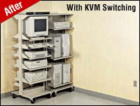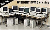 The Before and After photos above illustrate how much space and, in turn, expense that just one ServSwitch can save in an eight-server PC application. Advanced KVM switches evolved out of the need for organization and control. Five years ago, even in a large business, a data centre might have had six or seven servers. Today, that number might be more than 1000. Desktop ServSwitches for programmers or administrators that need to work with multiple operating systems. Dual and Quad head Desktop switches are ideal for Mulit-head applications and DVI Desktop Switches can be used where high end DVI video cards and flat-panel displays are necessary. To find out which Desktop KVM Switch is right for you, call Black Box technical support on 055 451 70 71 or e-mail support@black-box.ch. Take a closer look and browse the selection of Desktop ServSwitches in our online catalogue. Single-User Rackmount ServSwitches Rackmount ServSwitches usually have an on screen display so that servers can be named and accessed via a server list rather than by port number. They also often have security features such as passwords and user access lists and can be cascaded together to increase capacity. Single user rackmount ServSwitches are available for PC only as well as Multi-platform environments and some are even able to support serial devices allowing the management of servers and network devices all from one KVM. To find out which Single-User Rackmount KVM Switch is right for you call Black Box techincal support on 055 451 70 71 or e-mail support@black-box.ch. Take a look at our range of Single-User Rackmount ServSwitches in our online catalogue. Multi-User ServSwitches have an on screen display to make access to servers and administration of the switch system easy. They also often support multiple hardware platforms and can be cascaded for ease of expansion. The number of users that can simultaneously use a ServSwitch system is limited by the number of video paths available in the switch matrix. For this reason it is essential to plan ahead when specifying your switch solution. If you order a single-user KVM switch now you can easily add more CPUs by cascading another switch to the system later but additional simultaneous users can not be added in this way. To find out which Multi-head KVM Switch is right for you call Black Box technical support on 055 451 70 71 or e-mail support@black-box.ch. Take a closer look at our range of Multi-User ServSwitches. CAT5 ServSwitches CAT5 KVM extenders have been available for some time and are often added to ServSwitch solutions to move KVM stations out of the server room. This increases server room security and allows users to work in comfortable and convenient locations. Traditional ServSwitches use proprietary cable sor VGA and PS2 cable to connect CPUs and KVM stations to the switch. While giving excellent preformance, these are limited in length and are thicker and more expensive than CAT5 cables. CAT5 cables are very inexpensive, easy to install and are often already in place. Switches utlising this technology are slim-line high-density devices that use up very little rack space and are quick to install. CAT5 KVM switches are available for single-user and multi-user applications and are available with Multi-platform and serial support. To find out which CAT5 KVM switch is right for you call Black Box technical support on 055 461 70 71 or e-mail support@black-box.ch. To find out more about our CAT5 ServSwitches have a look at our online catalogue. KVM Over IP allow access to ServSwitches over IP solve this problem giving users flexible access at a very low level. In addition, no software need be loaded onto the managed CPUs. By adding IP connectivity to your ServSwitch solution or by selecting a ServSwitch with built-in IP connectivity you can ensure secure 24/7 access to your mission critical systems from anywhere in the world. To find out which KVM over IP solution is right for you call Black Box technical support on 055 451 70 71 or e-mail support@black-box.ch To see our KVM over IP ServSwitches in more detail have a look at our online catalogue. Secure KVM switching for networks with multiple security classifications With a TEMPEST-approved* BLACK BOX® ServSwitch Secure (with USB), you can switch between networks with multiple security classifications - and be assured that snoopers are being kept away from your data.