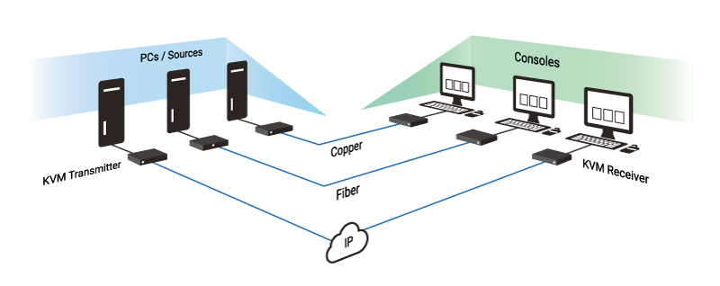 KVM extenders are used in a huge range of applications in almost all sectors. From power stations to churches and from server farms to supermarkets, KVM extenders are deployed to overcome distance limitations of analog and digital interface cables. KVM extenders typically consist of a transmitter unit connected to the source (e.g. a PC or server), a receiver unit connected to the user workstation (monitor, keyboard, mouse, speakers and other peripheral devices) and a network cable that connects both (CATx or Fibre). Here are some common application examples for the technology.